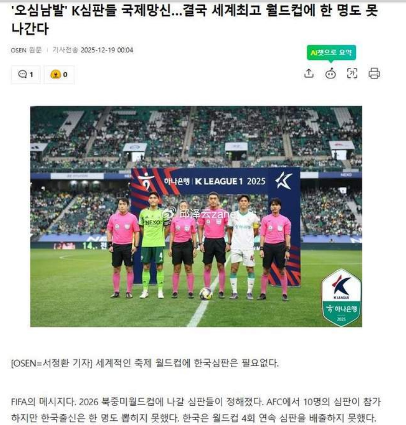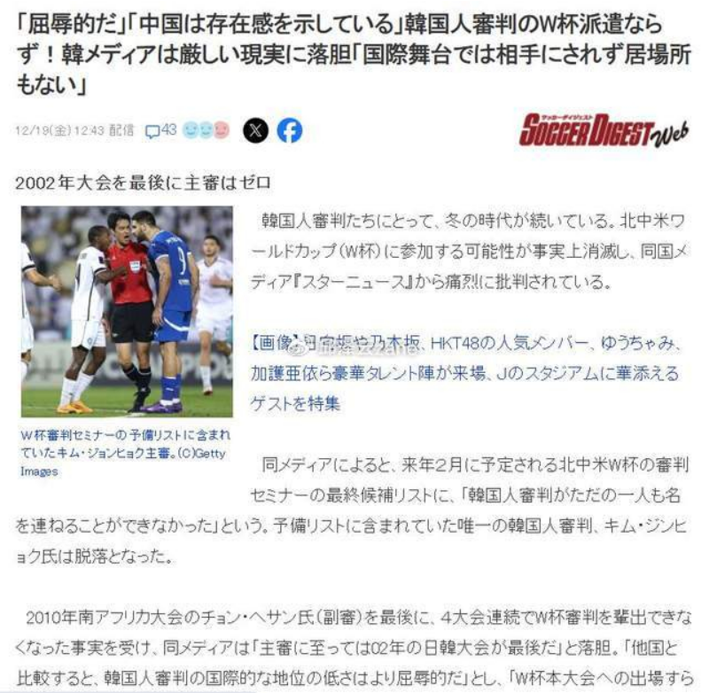 由于马宁入围,今天凌晨又以第四官员身份执法了阿拉伯杯的决赛,甚至很有可能成为明年世界杯的主裁判,韩国媒体直接是以马宁作为封面进行了大量报道,韩国媒体认为中国世界杯都没进,裁判却能崭露头角,更是让他们感到非常失望和羞愧。