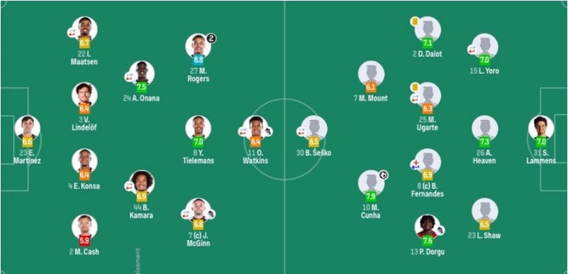 阿斯顿维拉首发:23-大马丁、3-林德洛夫、4-孔萨、2-卡什、22-马特森(75'12-迪涅)、24-奥纳纳(84'10-布恩迪亚)、8-蒂莱曼斯、27-罗杰斯、44-卡马拉(88'26-博加德)、7-麦金(84'29-盖桑)、11-沃特金斯(75'17-马伦)