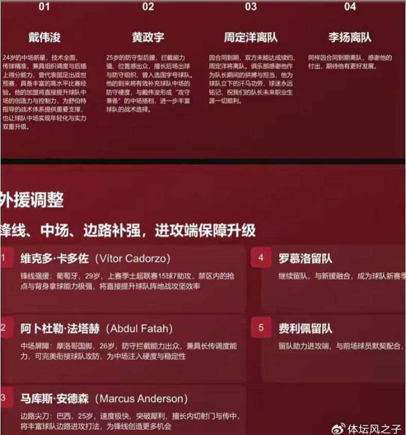 在外援调整方面,PPT上也有比较详细的介绍,称罗慕洛和费利佩将会留队,另外会引进三名新外援,分别是维克多·卡多佐、阿卜杜勒 - 法塔赫和马库斯·安德森,不过这三名球员同样在数据网站上毫无踪迹,综合来看,这两页PPT中的消息真实性确实是存疑的。在正式官方消息公布前,球迷们还需保持理性,切勿被这些未经证实的传闻过度影响。成都蓉城新赛季的阵容究竟如何,还需等待俱乐部官方给出确切答案。