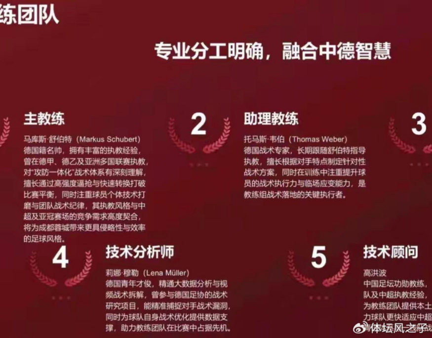 下赛季成都蓉城的目标肯定依旧是争冠的,而如果想要继续冲击冠军的话,就必须对现有阵容进行补强,就在近日,疑似成都蓉城新赛季的一份引援名单泄露了出来,成都蓉城球迷圈突然流传起两页关于新赛季主帅及引援名单的PPT,不过目前尚无法确定这些信息的真实性,首先从PPT内容来看,成都蓉城新赛季主帅疑似锁定为德国教练马库斯·舒伯特,但是在各大体育网站和专业数据库中,却没有找到这位教练的相关信息。