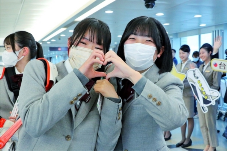 日本京都橘高校吹奏乐部团员18日搭机抵台,入境时,学生们相当开心,频向接机人士挥手、比爱心。