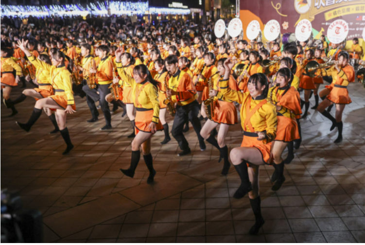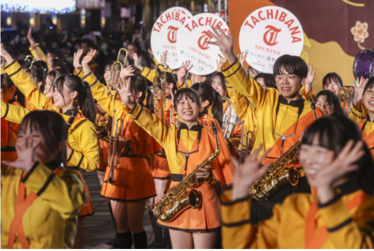 日本京都橘高校吹奏乐部再度应邀访台,18日晚间为“2025台湾远征–吹响友谊,舞动青春”系列活动亮相台北西门商圈踩街,并在中山堂广场定点演出,整齐队形与招牌笑容传达满满活力与热情。