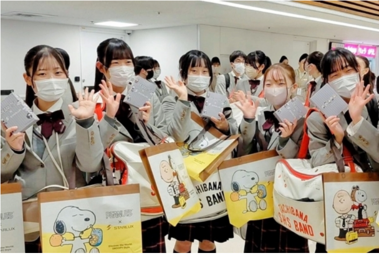 日本京都橘高校吹奏乐部团员18日搭机抵台,团员们在桃园国际机场开心合影留念,晚间将在台北西门町热情踩街演出。