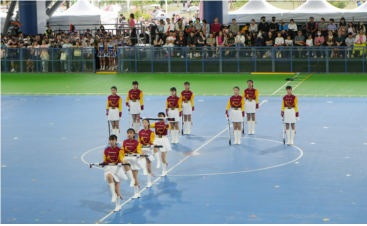 日本京都橘高校吹奏乐部20日首度前进屏东演出,并与台湾在地学子交流,屏东女子高级中学仪队(图)以刚柔交织枪法、精准高踏步带来充满韵律与视觉张力演出,展现“红色蔷薇”魅力。