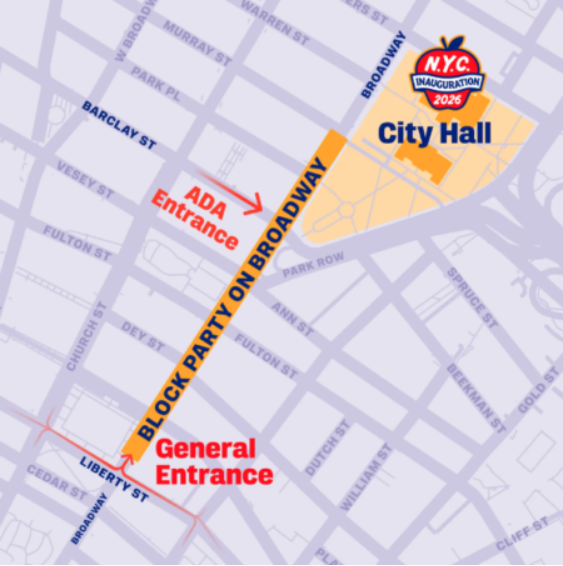 交接团队表示,除市政厅前约4,000名持票宾客外,还将在曼哈顿下城的英雄峡谷,自由街(Liberty St)至莫瑞街(Murray St)之间的百老汇大道(Broadway),设置街区派对,让数以万计的市民能通过大萤幕观看典礼并参与庆祝。民众须事先至交接官网登记,活动亦提供线上直播,观看同样需注册。