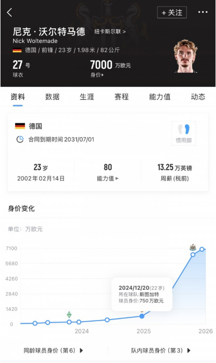 去年夏窗,沃尔特马德的身价仅为400万欧元,到2025年冬窗涨至750万欧元。2025年夏窗各大豪门的竞价战让沃尔特马德的身价一飞冲天,在求购多人无果后,纽卡斥资7500万欧元签下沃尔特马德,当时他的身价才3000万欧元。