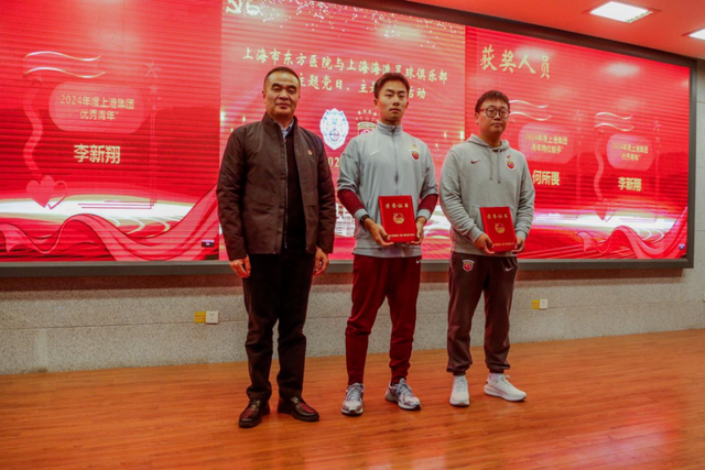 东方医院党委书记李明为海港俱乐部荣获2024年度上海集团“青年岗位能手”“优秀青年”称号的代表颁奖。
