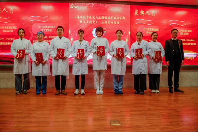 海港俱乐部党总支书记、总经理沙良昌为东方医院在2025年度浦东新区青年岗位建功行动中脱颖而出的3支青年突击队及5支青年文明号集体负责人颁奖。