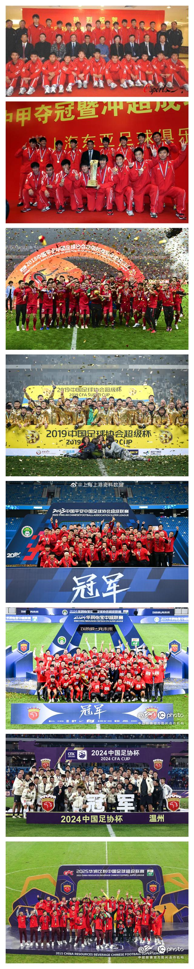 上海海港队夺得中乙、中甲、中超、中国足协杯以及超级杯冠军,实现国内荣誉大满贯。
