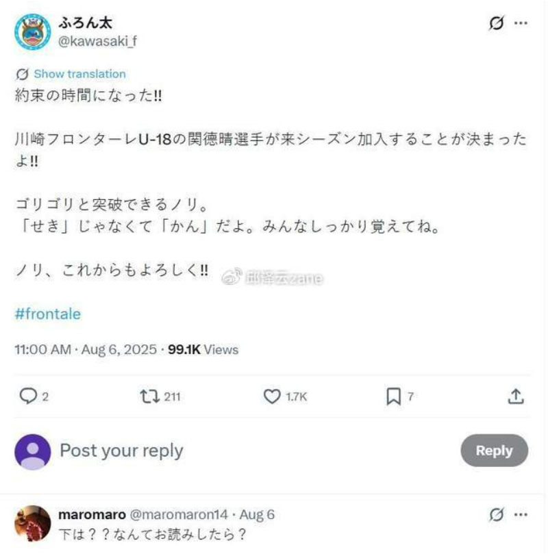 川崎前锋官方媒体曾在8月份就宣布,关德晴和另一名年轻小将一同进入下赛季一线队,他们将代表川崎前锋出战下赛季的J联赛,当时川崎前锋官方吉祥物账号曾发文表示,关德晴的关读音是源自中国姓氏的关,而不是日本本土起源的关,足以看出他和中国的渊源。