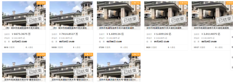 拍卖信息显示,此次拍卖的标的物为“深圳市观澜街道高尔夫大道观澜湖高尔夫大宅*蔓菲亚区E4栋房地产及附属设施、设备(第八次)”,“起拍价:6673万3675元,评估价2亿114万750元”,参加拍卖需缴纳“证金1334万元”。