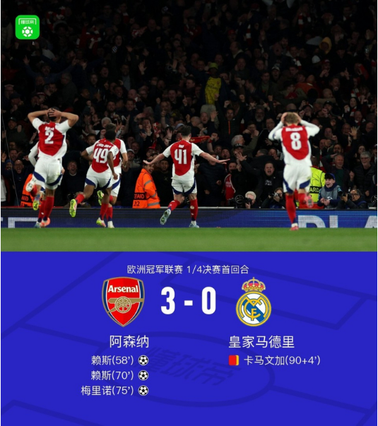 4、24/25赛季欧冠1/4决赛首回合,阿森纳3-0皇马 热度值:3339035