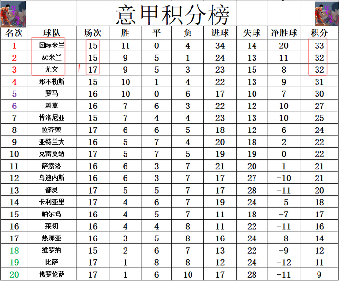 积分榜方面,尤文先赛赢球后夺取3连胜,多赛2场的他们追上AC米兰,净胜球劣势排在第3,暂时只比榜首的国米少了1分。黑马科莫止住颓势,暂时超过博洛尼亚,重新回到前6。
