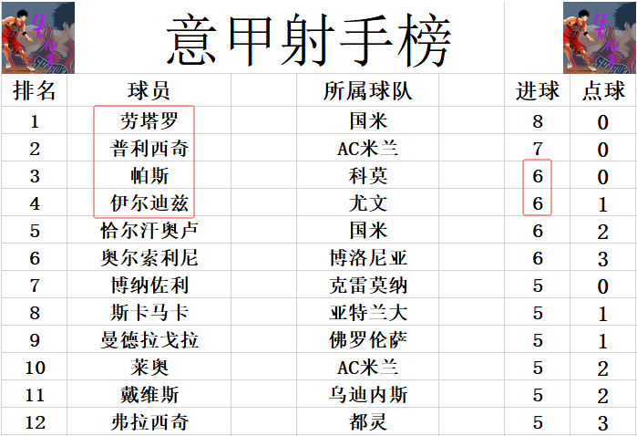 射手榜方面,意甲依然是五大联赛唯一无人进球上双的联赛,劳塔罗8球继续领跑,普利西奇7球位列第2。伊尔迪兹今天打入锁定胜局的一球,帕斯传射建功,他们追上恰尔汗奥卢和奥尔索利尼,4人6球并列第3。