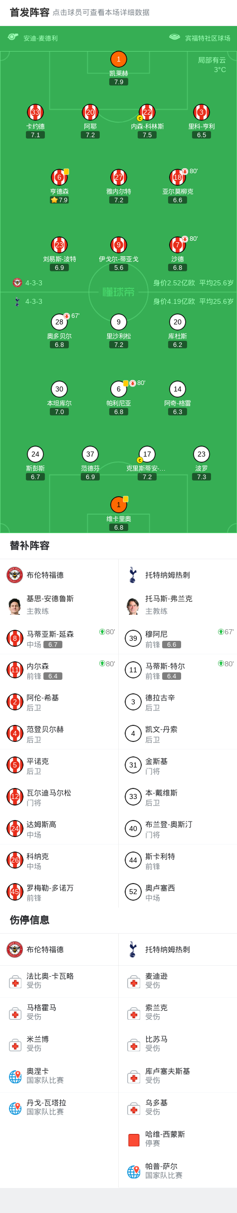 北京时间1月2日英格兰足球顶级联赛 联赛 第19轮,布伦特福德主场对阵托特纳姆热刺。上半场,沙德进球因越位在先被吹。下半场,两队依旧毫无建树,热刺全场只有3射正。全场比赛结束,热刺0-0布伦特福德。