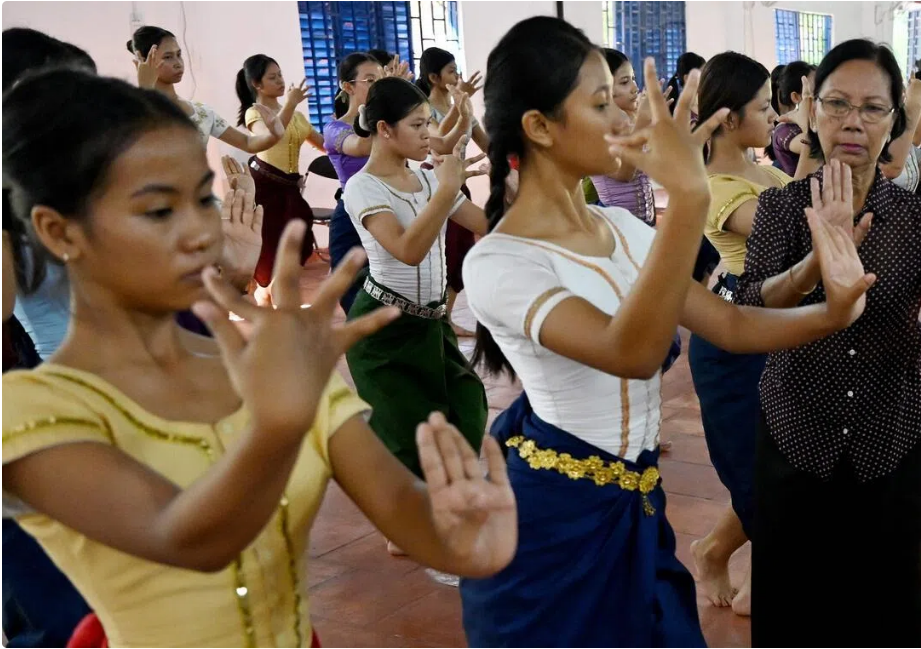 一名高棉古典舞教师(右)在金边艺术中学的舞蹈室里细心调教青少年学员,以培育新一代舞者。