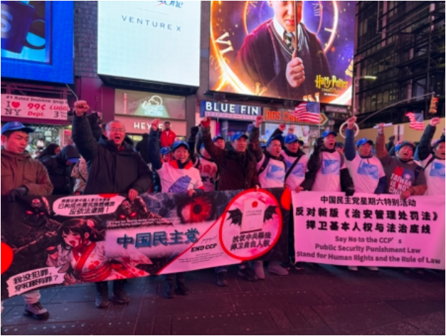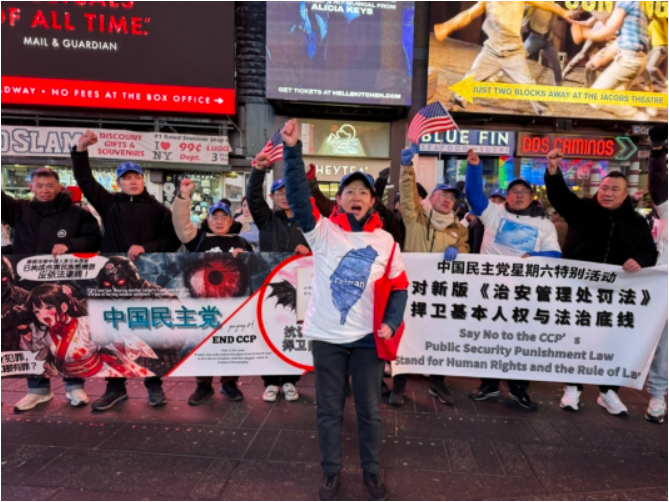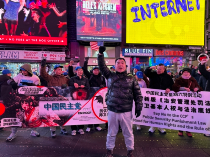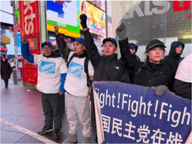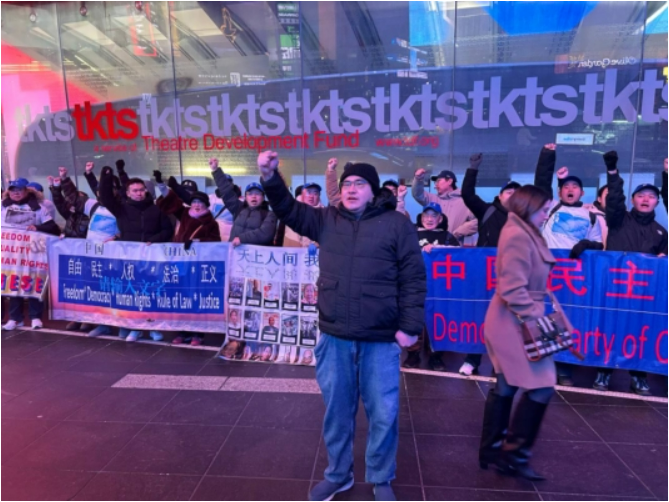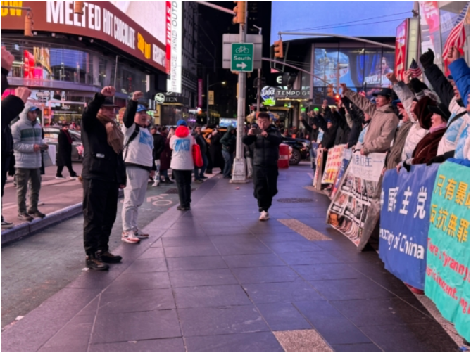 中国民主党3日晚上在纽约时代广场举行每周一呼的茉莉花活动,抗议中共暴政和迫害。虽然天气寒冷,但是马杜罗被生擒的消息让他们兴奋。他们高喊:“打倒中国共产党!共产党下台!习近平下台!暴政必亡!Free Free China !”他们的呐喊声吸引了不少行人停下脚步拍照及询问了解。