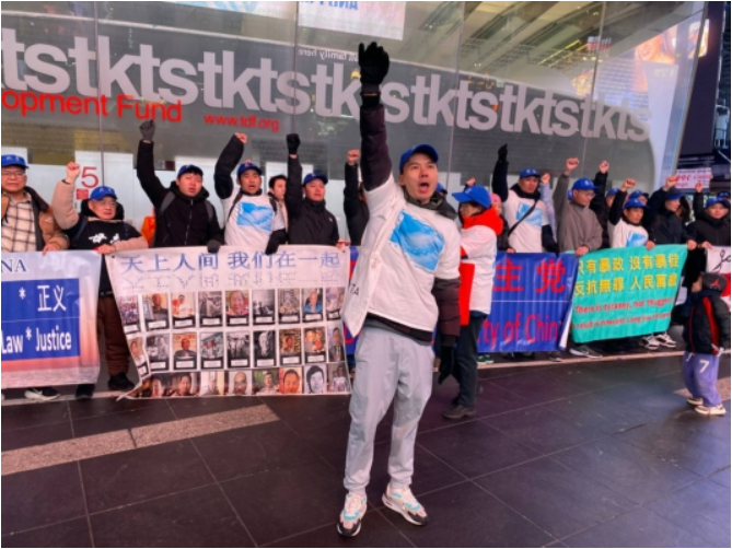 苏朝洪(前排喊口号者)表示:希望“打倒中国共产党、习近平下台”的声音,能够被世界听到。