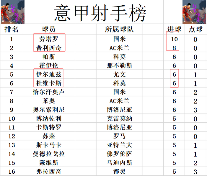 射手榜方面,劳塔罗10球领跑,普利西奇8球位列第2,伊尔迪兹今天错失多次机会,被今天梅开二度的杜维卡斯追上,他们和霍伊伦,恰尔汗奥卢,莱奥,奥尔索利尼等人6球并列第3。