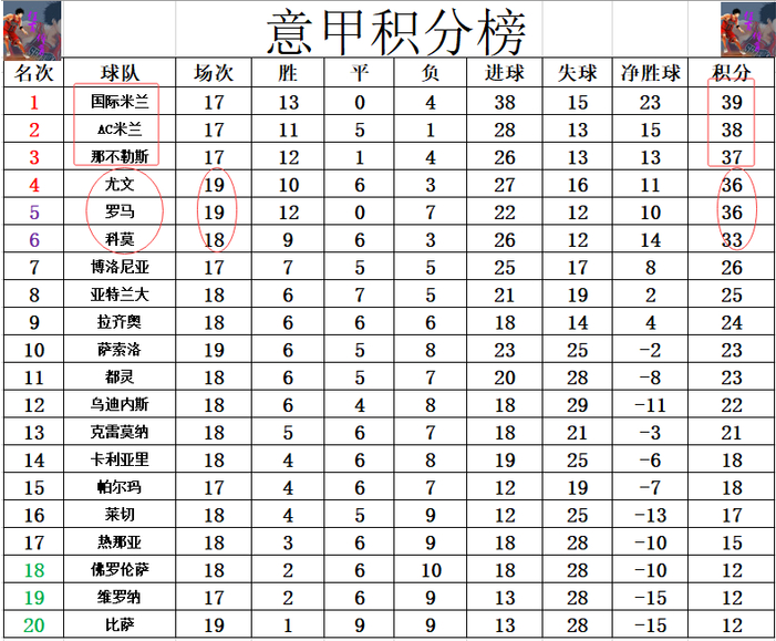 积分榜方面,国米,AC米兰和那不勒斯的榜首竞争依然激烈,国米1分优势力压AC米兰领跑,AC米兰则是多那不勒斯1分位列第2。尤文,罗马齐齐赢球,尤文1个净胜球的微弱优势力压罗马守住第4。黑马科莫3连胜,少赛一场,只少罗马,尤文3分,他们补赛要是能赢球的话,就能超过尤文,这第4的争夺比榜首还要惨烈。