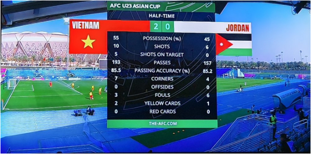 从上半场的技术统计看,越南队控球率55%领先约旦的45%;