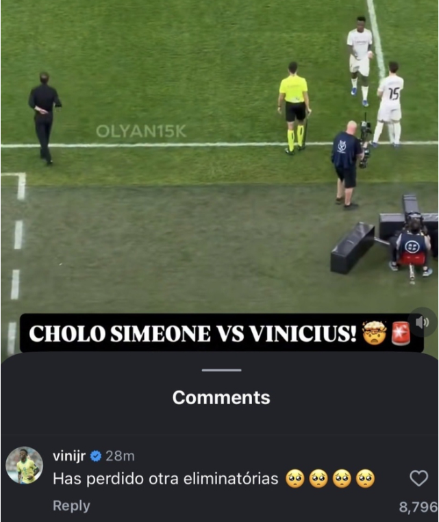 当晋级西超杯决赛后,维尼修斯也霸气回击西蒙尼。他在社媒评论了关于他与西蒙尼的动态,并且评论道:“(西蒙尼)又输掉一场淘汰赛。”