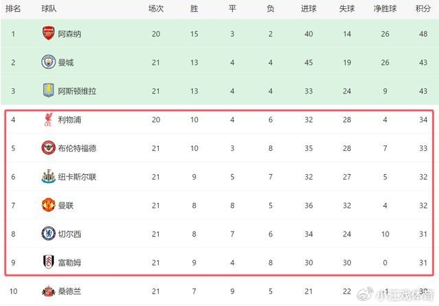 从目前来看,英超争四已经大乱,从第四的利物浦,到第九的富勒姆,这6支球队就差了3分。虽然利物浦还少赛1轮,但是他们将做客阿森纳,看起来也凶多吉少。本赛季,除了排名前三的球队之外,英超其他强队的表现,都很难让球迷满意。哪怕是夏窗斥巨资引援的利物浦,也很难保证赛季结束时,自己肯定能拿到第四名。接下来,英超争四将会更加激烈,大家认为谁能笑到最后呢!