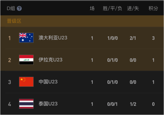 首轮战罢,澳大利亚队1胜积3分暂列榜首;U23国足和伊拉克都是1平积1分,但因多吃1张黄牌因此在公平竞赛积分上处于劣势,暂列第3位,泰国队1负积0分排名小组垫底。