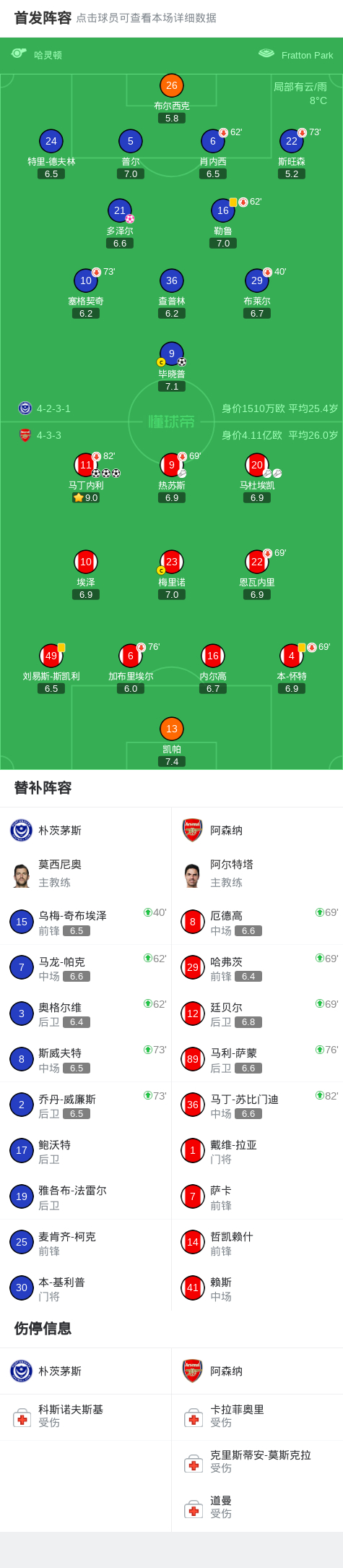 第69分钟,阿森纳连换3人,哈弗茨、廷贝尔和厄德高替补登场