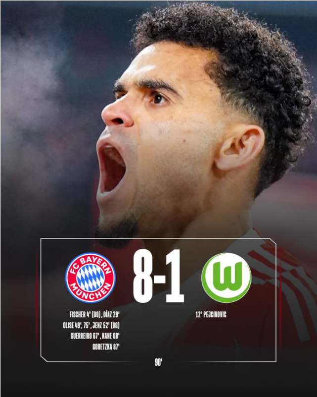 最终全场比赛结束,拜仁主场8-1大胜沃尔夫斯堡,取得2026年的联赛开门红!