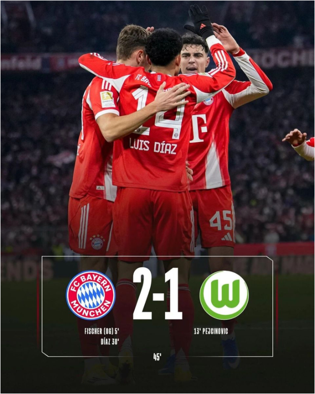 上半场战罢,拜仁主场2-1暂时领先沃尔夫斯堡。