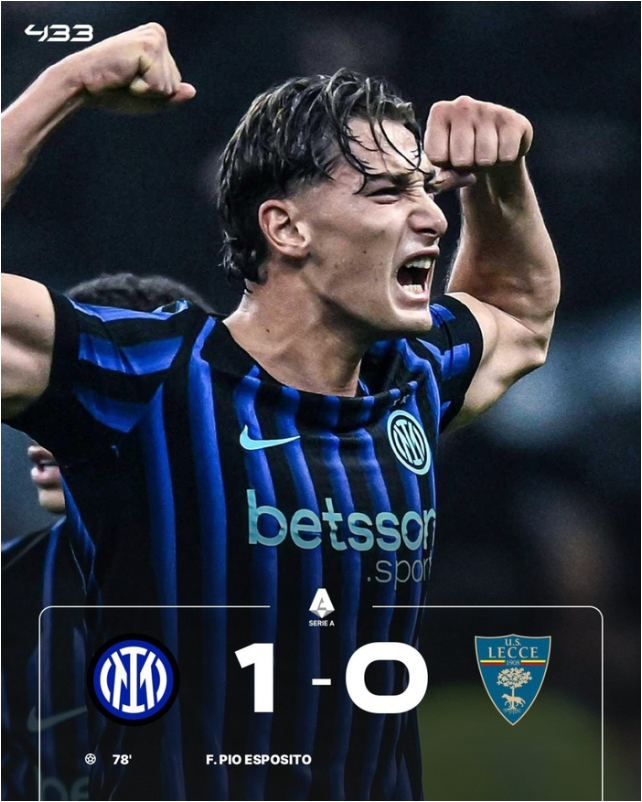 意甲第16轮,国米主场1-0击败莱切,暂时以6分优势领跑。博尼制造一次点球的判罚,经过VAR介入后被取消,替补上场的埃斯波西托打进制胜球。