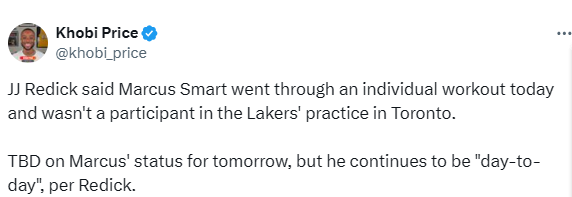 雷迪克表示,斯马特已进行个人训练,但没有参加湖人在多伦多的团队训练,对阵猛龙时的比赛状态目前尚不确定,球员现在仍处于“每日观察”的状态。