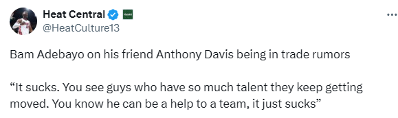 北京时间12月4日,NBA常规赛继续进行,热火对阵独行侠。赛前,热火球星阿德巴约接受媒体采访,谈及他对浓眉陷入交易流言的看法。