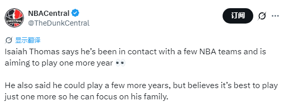 小托马斯坦言:“我现阶段的目标是至少再打一个赛季的NBA,而且我已经为重返赛场做好了充分准备,此前也和数支NBA 球队有过接洽。即便我依旧能在赛场上贡献高水平表现,但生活里还有更重要的事需要兼顾,首当其冲的就是我的孩子们,尤其是正在高中篮球队打拼的儿子,我要多花精力帮他实现篮球抱负。”