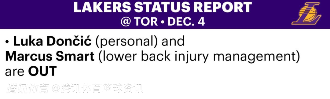 北京时间12月4日,NBA常规赛继续进行,湖人明日将对阵猛龙。赛前,湖人方面公布本场比赛伤情报告,东契奇(个人原因)、斯马特(下背部伤势管理)将缺席本场比赛。