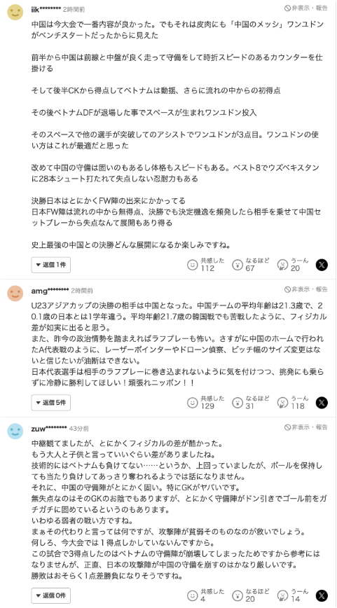 对于这支全新的中国男足,很多日本球迷也给予了很高的评价。在日本《雅虎体育》相关的新闻评论区,有日本球迷留言道:“我们必须重新审视这支中国队的防守,它不仅坚固,而且球员在身体和速度上都有优势。在1/4决赛,他们被乌兹别克斯坦队射门28次却没丢球,也展现了其韧性。决赛中,日本队能否获胜完全取决于前锋线的表现。如果在决赛中,日本前锋频频浪费机会,让对方起势,那中国队有可能通过定位球得分,并带走冠军。史上最强的中国队,决赛会如何展开,真是令人期待。”
