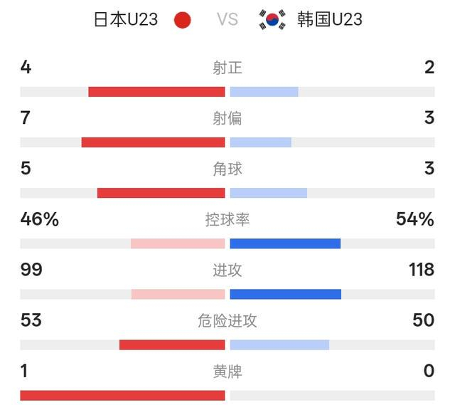 本场比赛,韩国队排出了4-5-1阵型,意图加强中场控制。然而,日本队的4-2-3-1阵型在传控和逼抢上做得更为出色。从比赛第一分钟起,日本队就通过高强度前场压迫,打乱了韩国队从后场组织的节奏。整个上半场,韩国队仅完成1次射门,而日本队则创造了10次射门机会,控球率和进攻主导率全面占优。全场技术统计: