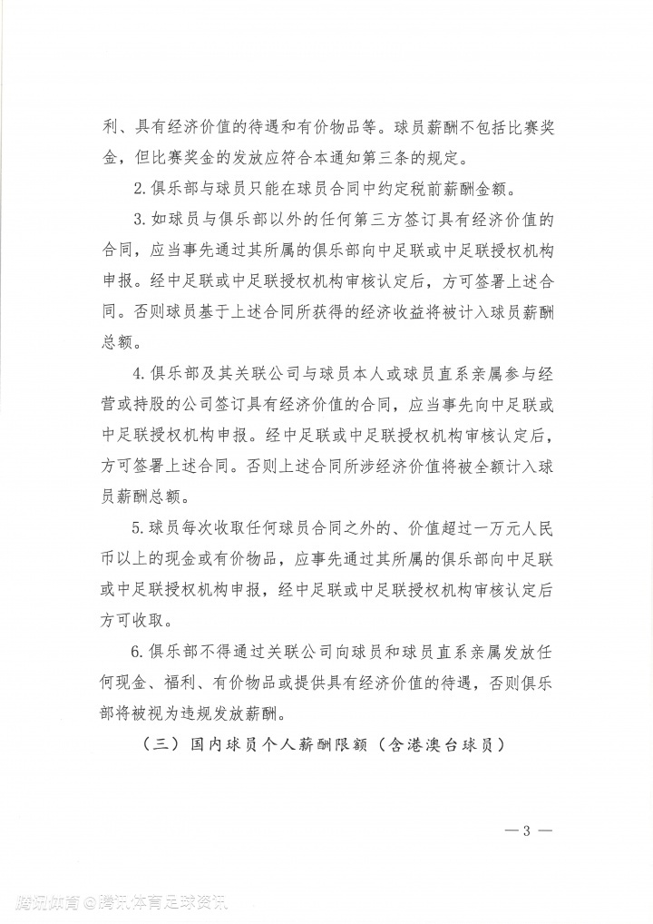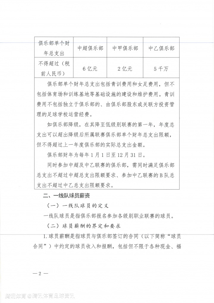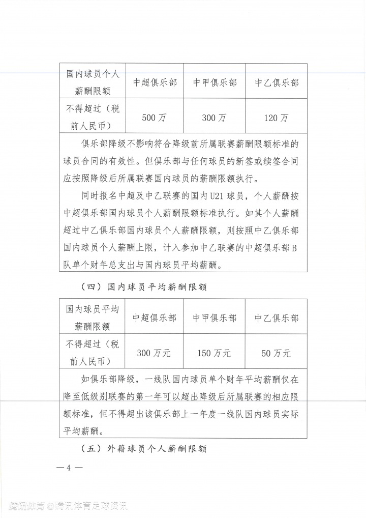 北京时间12月3日,中国足球职业联赛联合会正式发布《关于印发中国足球职业联赛俱乐部财务约定指标的通知》,其中明确了各级别联赛在新赛季的球员薪酬限额。