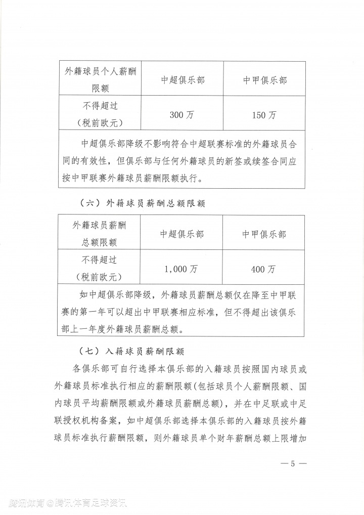 外援薪酬总额上限 增加80万欧元,但除入籍球员外的外援薪酬总额不得超过400万欧元(税前)