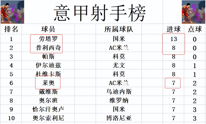 射手榜方面,劳塔罗13球高居榜首,普利西奇缺阵,和帕斯,伊尔迪兹,杜维卡斯8球并列第2。同样缺阵的莱奥和戴维斯,奥尔班,恰尔汗奥卢等人7球刚好挤入前十。