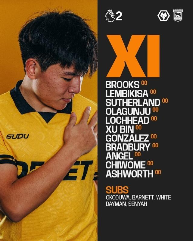 2025-26赛季英超U21联赛第14轮,狼队U21对阵伊普斯维奇U21。徐彬首发出场,迎来留洋生涯处子秀。
