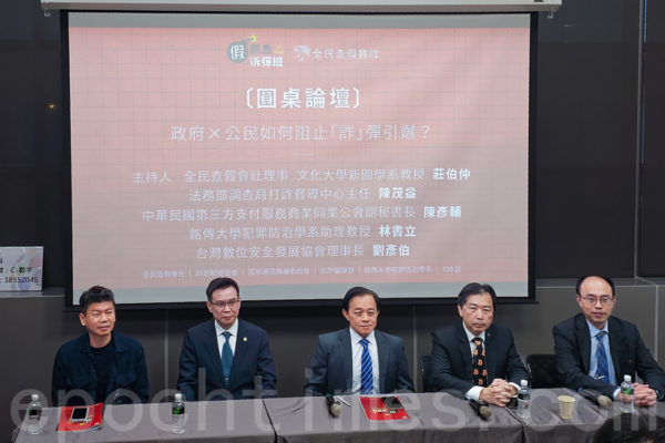 台湾《全民查假会社》日前举办年度论坛,主题之二为“从话术中解除诈骗引信”,由左至右为台湾数位安全发展协会理事长刘彦伯、中华民国法务部调查局打诈督导中心主任陈茂益、文化大学新闻学系教授庄伯仲、反诈骗联盟秘书长暨铭传大学犯罪防治学系助理教授林书立、中华民国第三方支付服务商业同业公会副秘书长陈彦辅。