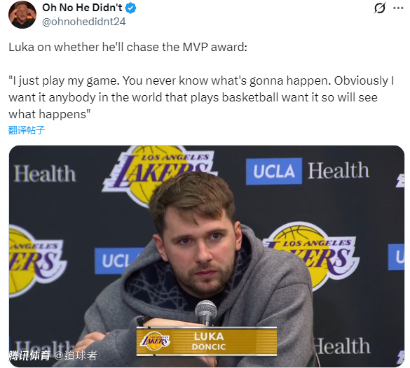 赛后谈到自己本赛季是否会去追逐MVP,东契奇表示:“我只是打好我的比赛。你永远不知道会发生什么。显然,我渴望得到它,世界上任何打篮球的人都想要得到它,所以我们拭目以待吧。”
