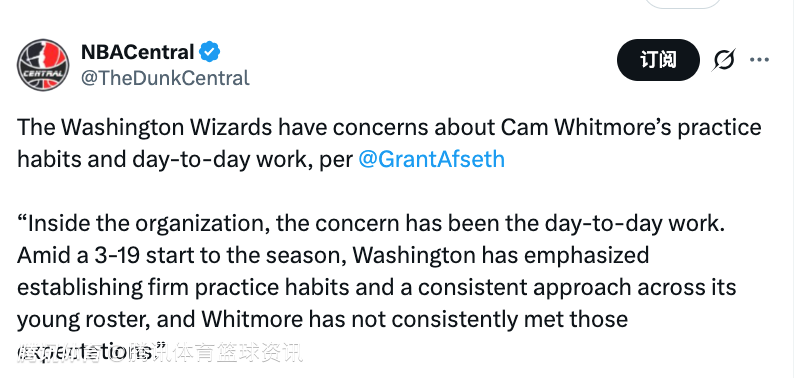 Grant Afeseth表示:“球队内部的顾虑集中在他的日常训练表现上。在赛季开局3胜19负的背景下,奇才队强调要在年轻阵容中建立严格的训练习惯和稳定的比赛态度,但惠特莫尔并未持续达到球队的这些要求。”