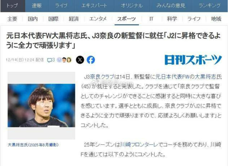 日本媒体最近也是多方报道了大黑将志成为奈良队主教练的消息,而且都不约而同地提到了他曾在中国踢球的标签,所以他这次上任,对于正在全力推动年轻球员留洋的中国足球来说,确实是一个重大利好了!